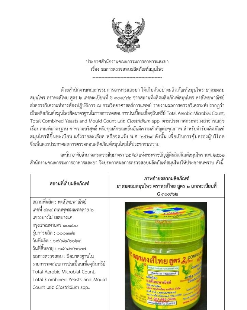 ด้วยสํานักงานคณะกรรมการอาหารและยา ได้เก็บตัวอย่างผลิตภัณฑ์สมุนไพร ยาดมผสม สมุนไพร ตราหงส์ไทย สูตร ๒ เลขทะเบียนที่ G ๓๐๙/๖๒ จากสถานที่ผลิตผลิตภัณฑ์สมุนไพร หงส์ไทยพาณิชย์ ส่งตรวจวิเคราะห์ทางห้องปฏิบัติการ ณ กรมวิทยาศาสตร์การแพทย์ รายงานผลการตรวจวิเคราะห์ปรากฏว่า เป็นผลิตภัณฑ์สมุนไพรผิดมาตรฐานในรายการทดสอบการปนเปื้อนเชื้อจุลินทรีย์ Total Aerobic Microbial Count, Total Combined Yeasts and Mould Count และ Clostridium spp. ตามประกาศกระทรวงสาธารณสุข เรื่อง เกณฑ์มาตรฐาน ค่าความบริสุทธิ์ หรือคุณลักษณะอื่นอันมีความสําคัญต่อคุณภาพ สําหรับตํารับผลิตภัณฑ์ สมุนไพรที่ขึ้นทะเบียน แจ้งรายละเอียด หรือจดแจ้ง พ.ศ. ๒๕๖๔ ดังนั้น เพื่อเป็นการคุ้มครองผู้บริโภค จึงเห็นควรประกาศผลการตรวจสอบผลิตภัณฑ์สมุนไพรให้ประชาชนทราบ