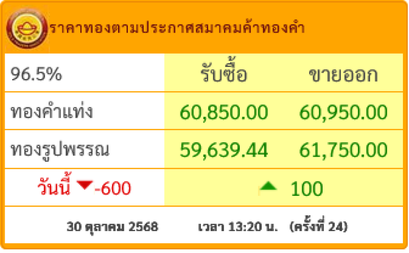 ราคาทองคำ วันที่ 30 ตุลาคม 2568 เวลา 13:20 น.(ครั้งที่ 24)