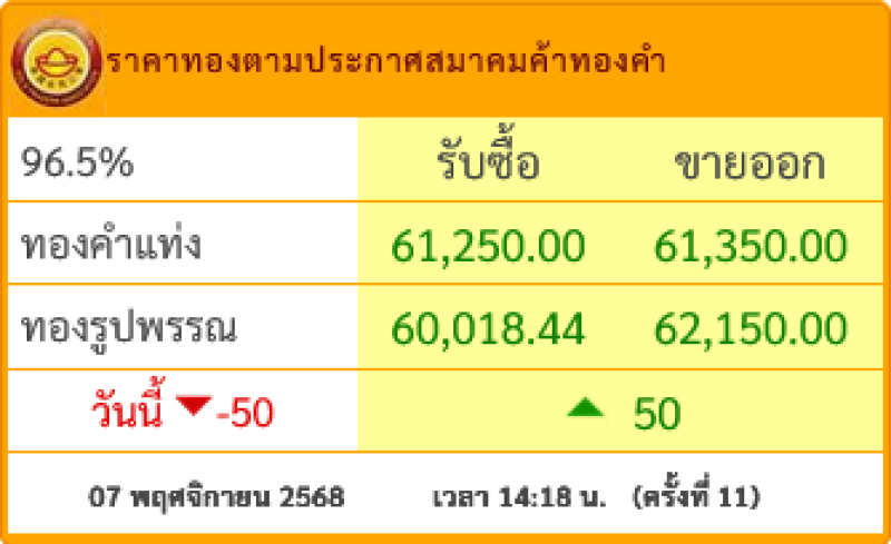 เปิดตลาด ราคาทองคำล่าสุดวันนี้ วันศุกร์ ที่ 7 พฤศจิกายน 2568 ราคาปรับลดลง 50 บาทราคาทองรูปพรรณวันนี้ เวลา 14:18 น. ปรับ(ครั้งที่ 11) ขายออกบาทละ 62,050.00 บาท