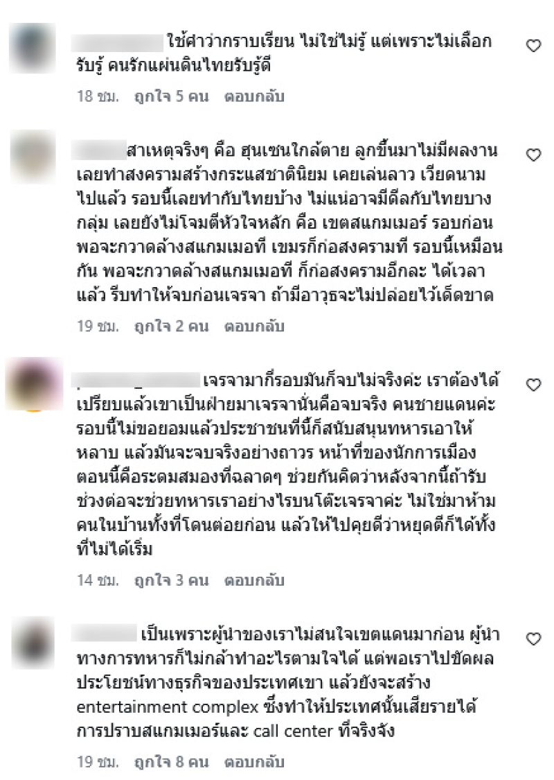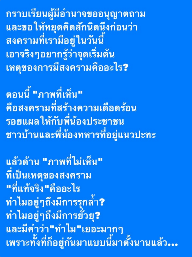 ตอนนี้ภาพที่เห็น คือสงครามที่สร้างความเดือดร้อน รอยแผลให้กับพี่น้องประชาชน ชาวบ้านและพี่น้องทหารที่อยู่แนวปะทะ แล้วด้าน ภาพที่ไม่เห็น ที่เป็นเหตุของสงคราม ที่แท้จริงคืออะไร ทำไมอยู่ๆถึงมีการรุกล้ำ? ทำไมอยู่ๆถึงมีการยั่วยุ? และมีคำว่าทำไมเยอะมากๆ เพราะทั้งที่ก็อยู่กันมาแบบนี้มาตั้งนานแล้ว